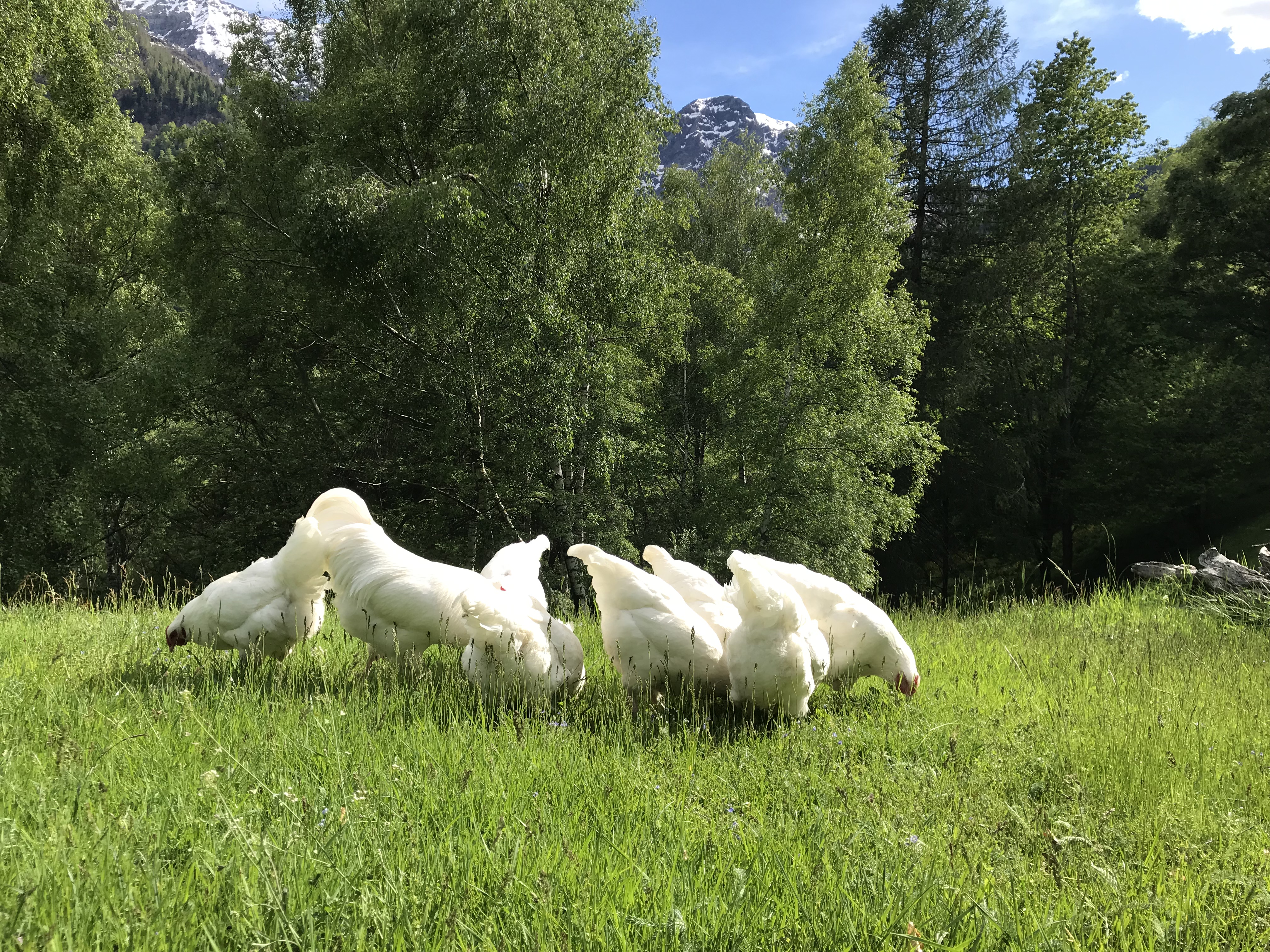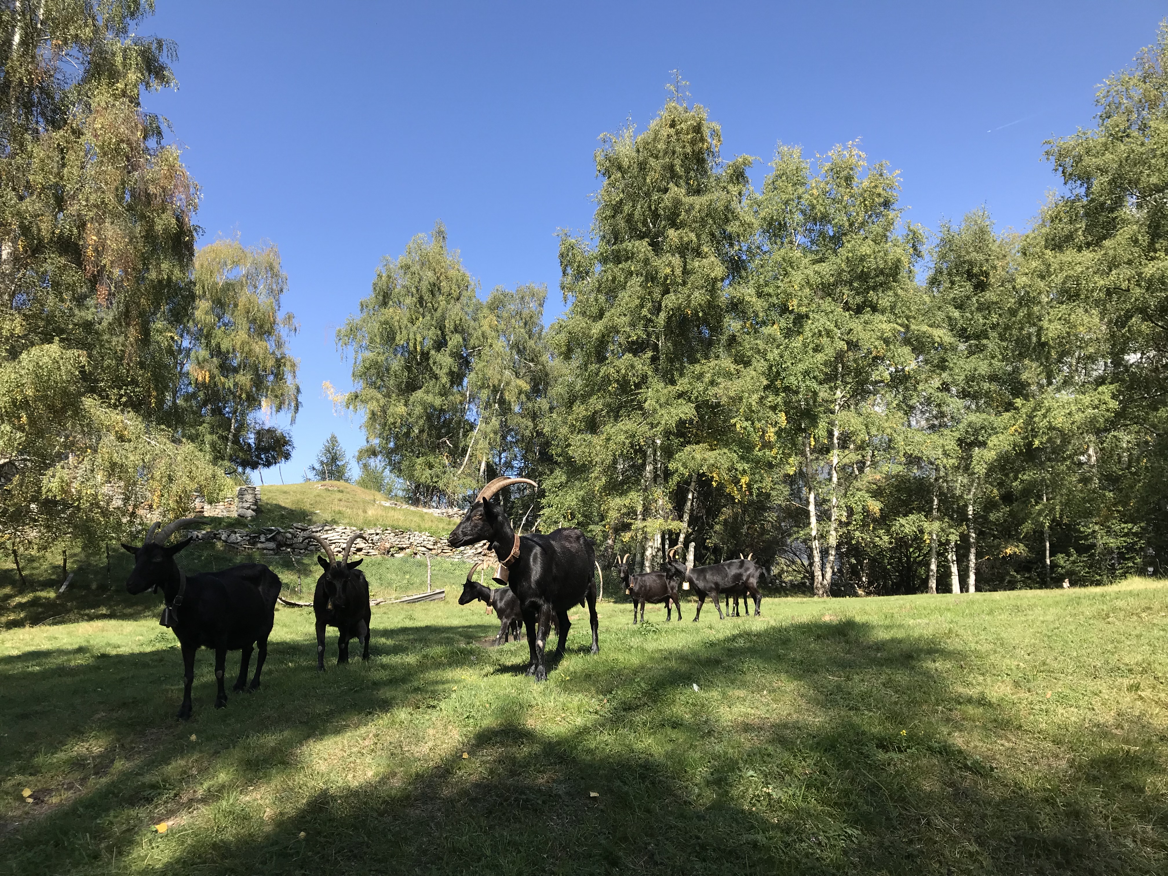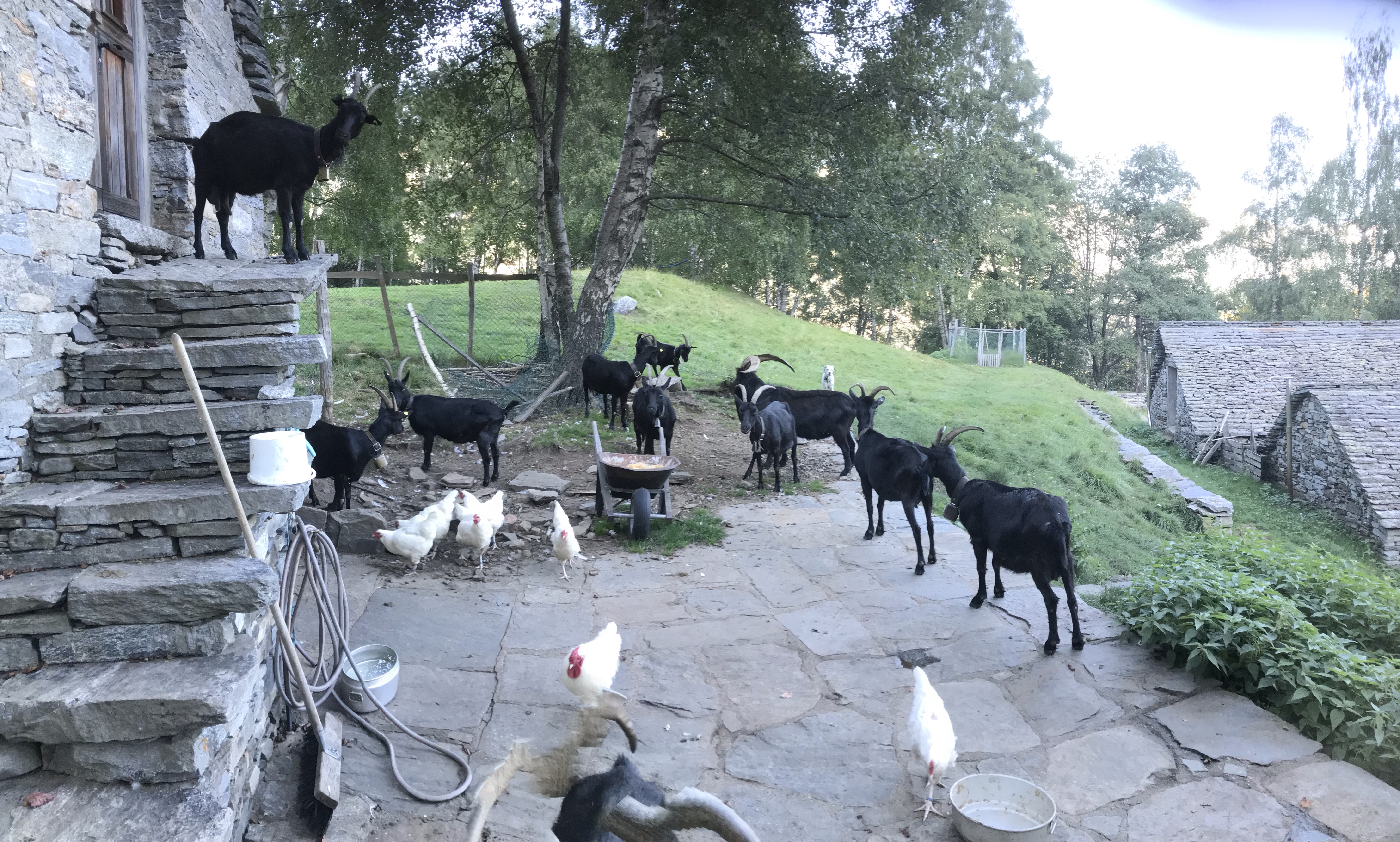 Auf der Alpe Soladino im Maggiatal werden verschiedene Tiere gesömmert: Nera Verzasca, Capra Grigia und weitere Ziegenrassen, Schweizer Hühner, Esel und Schwarze Alpenschweine.
