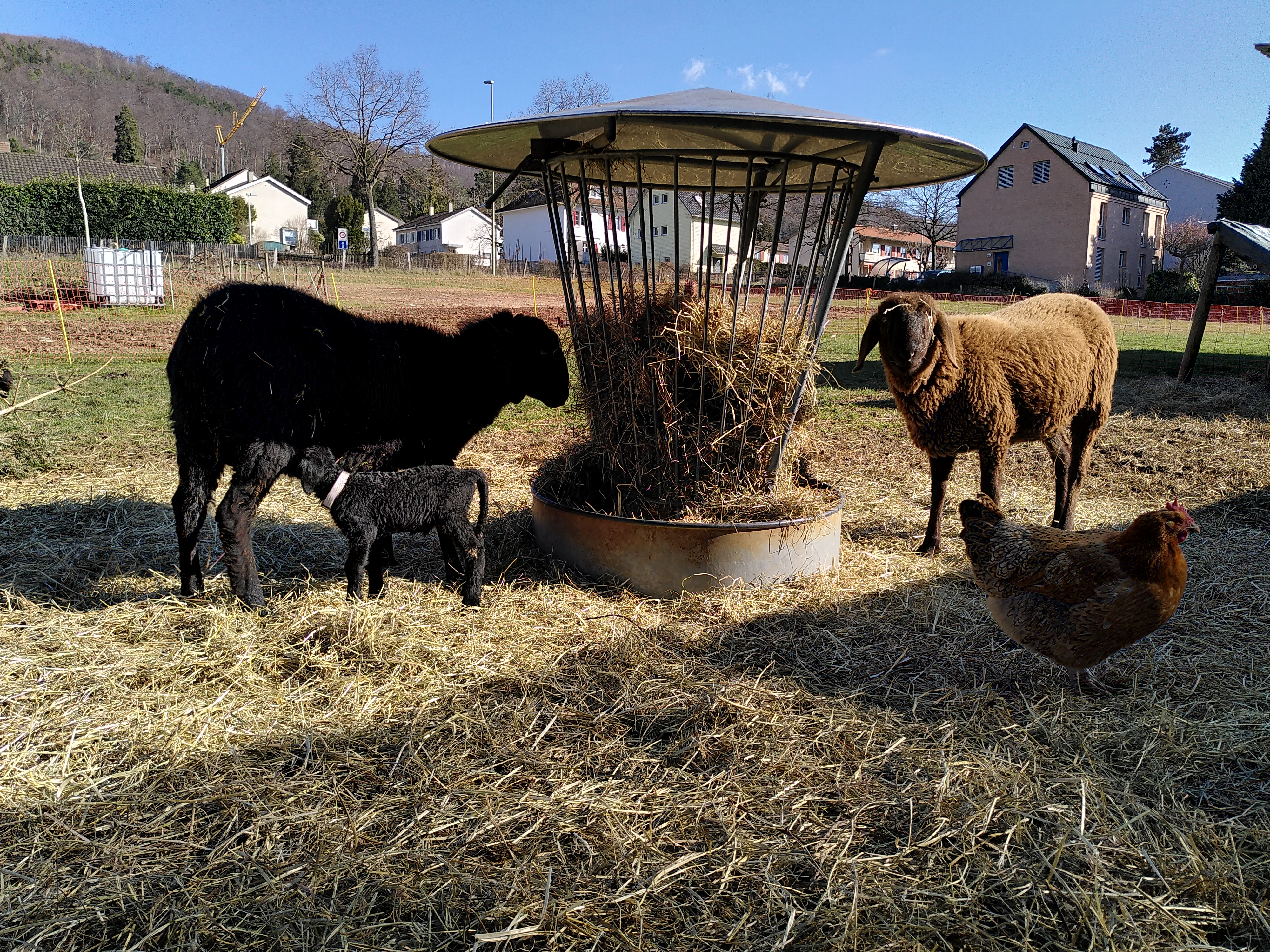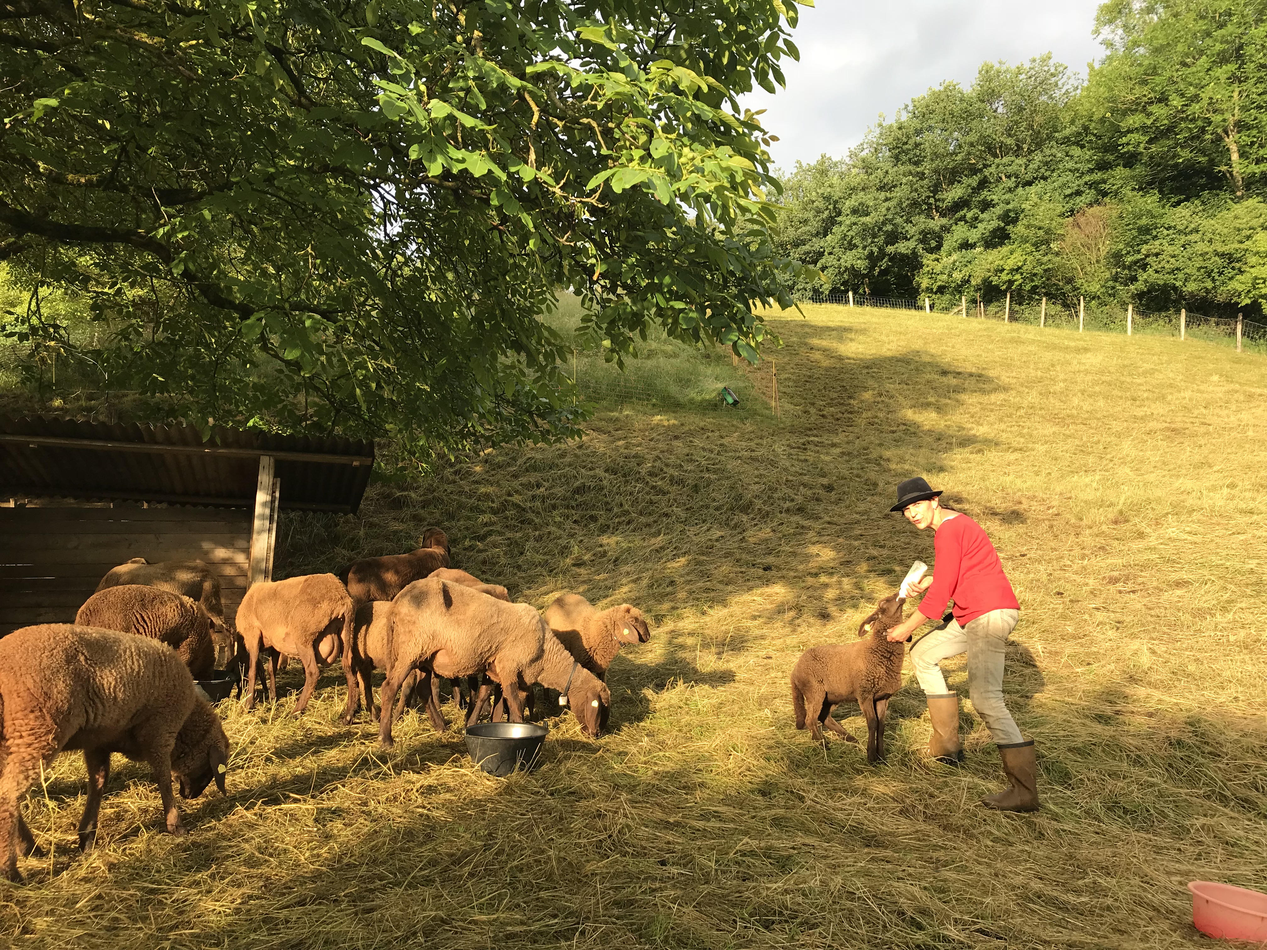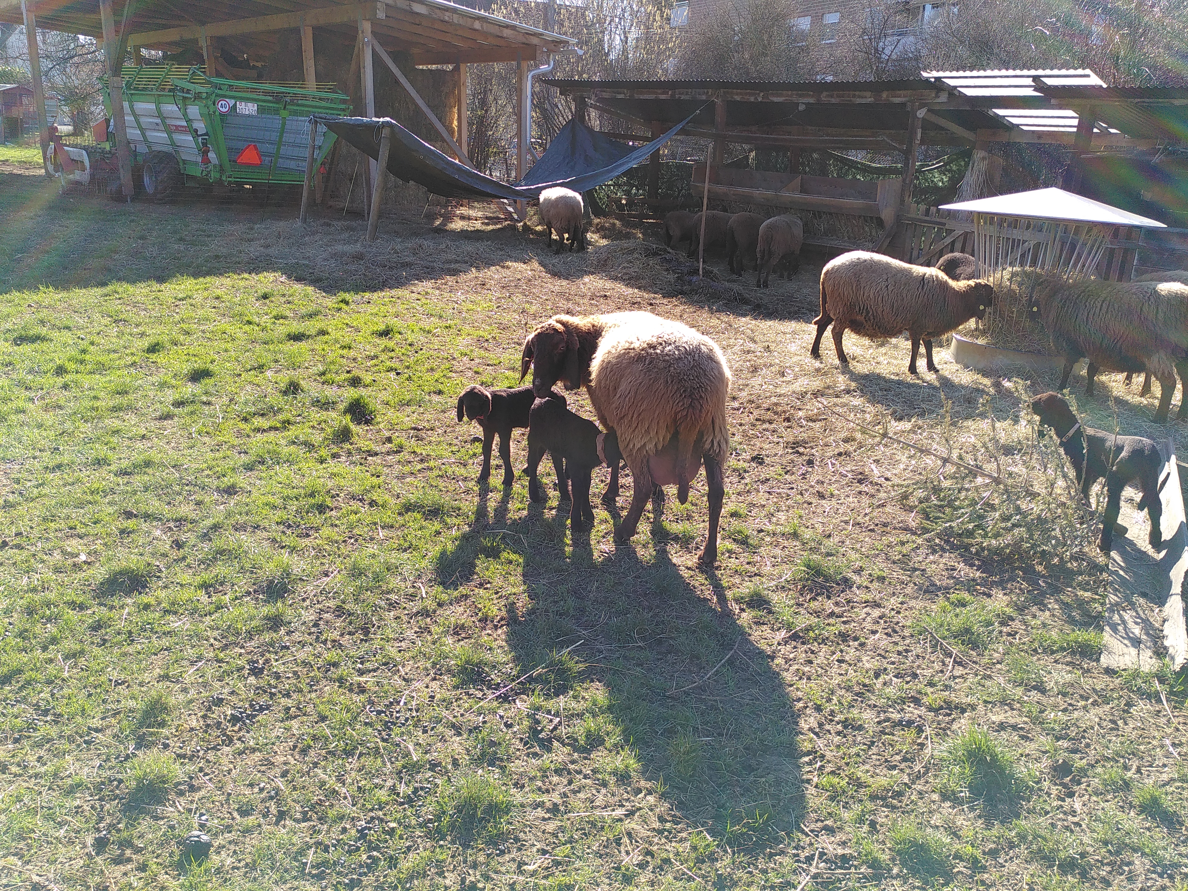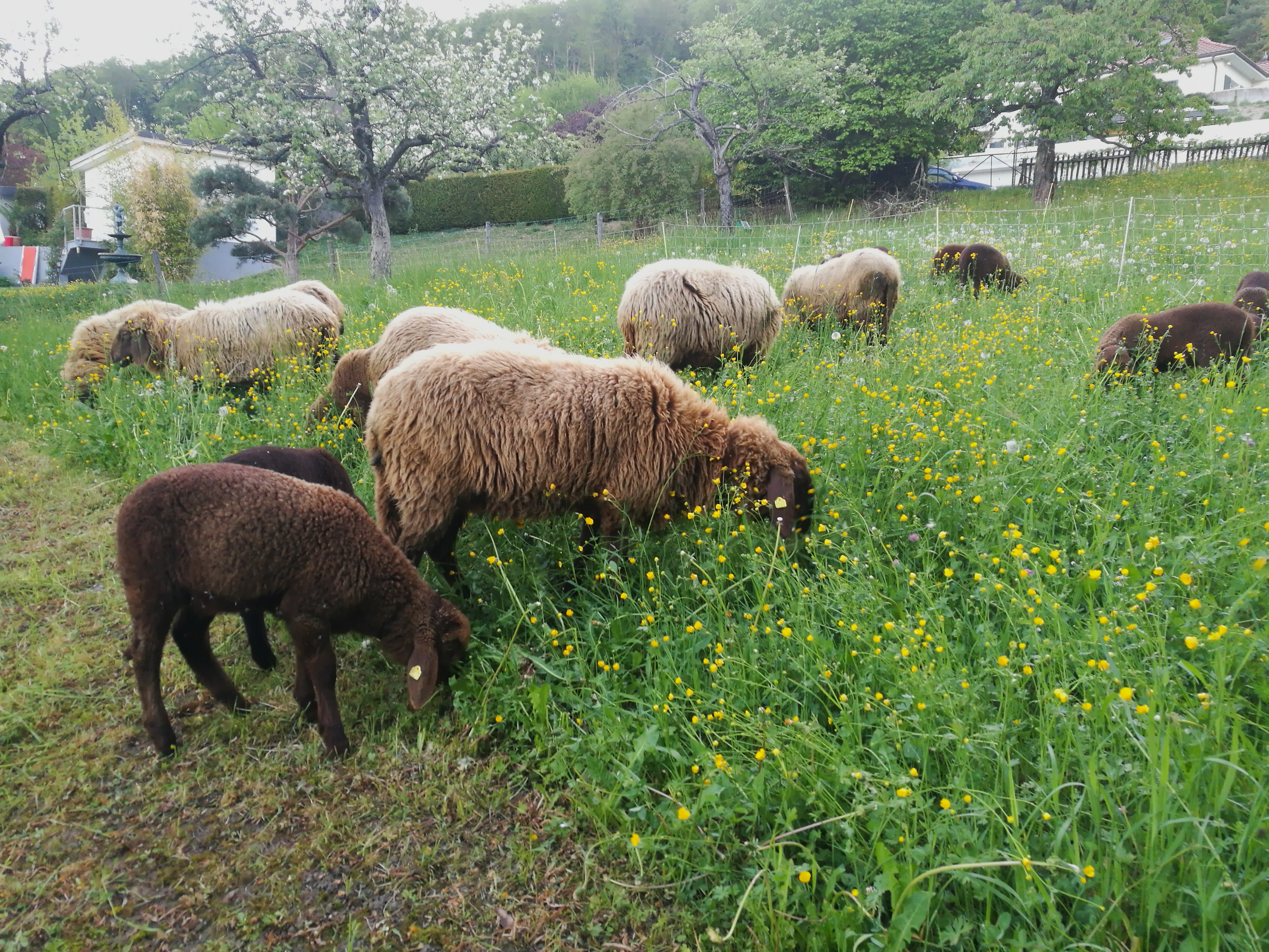 Wir halten 15 Mutterschafe und je nach Jahreszeit etwa 20 Lämmer und einen Bock. Wir ziehen in Arlesheim und Münchenstein von einer Weide zur anderen, insgesamt auf 10 Weiden. Das machen wir zu Fuss, zum Zügeln helfen uns immer Freundinnen und Freunde. Die männlichen Lämmer schlachten wir im Alter von 5-6 Monaten, die weiblichen Lämmer verkaufen wir als Zuchttiere, wenn sie schön sind. Wir scheren die Schafe jeweils Ende Mai und Ende September.