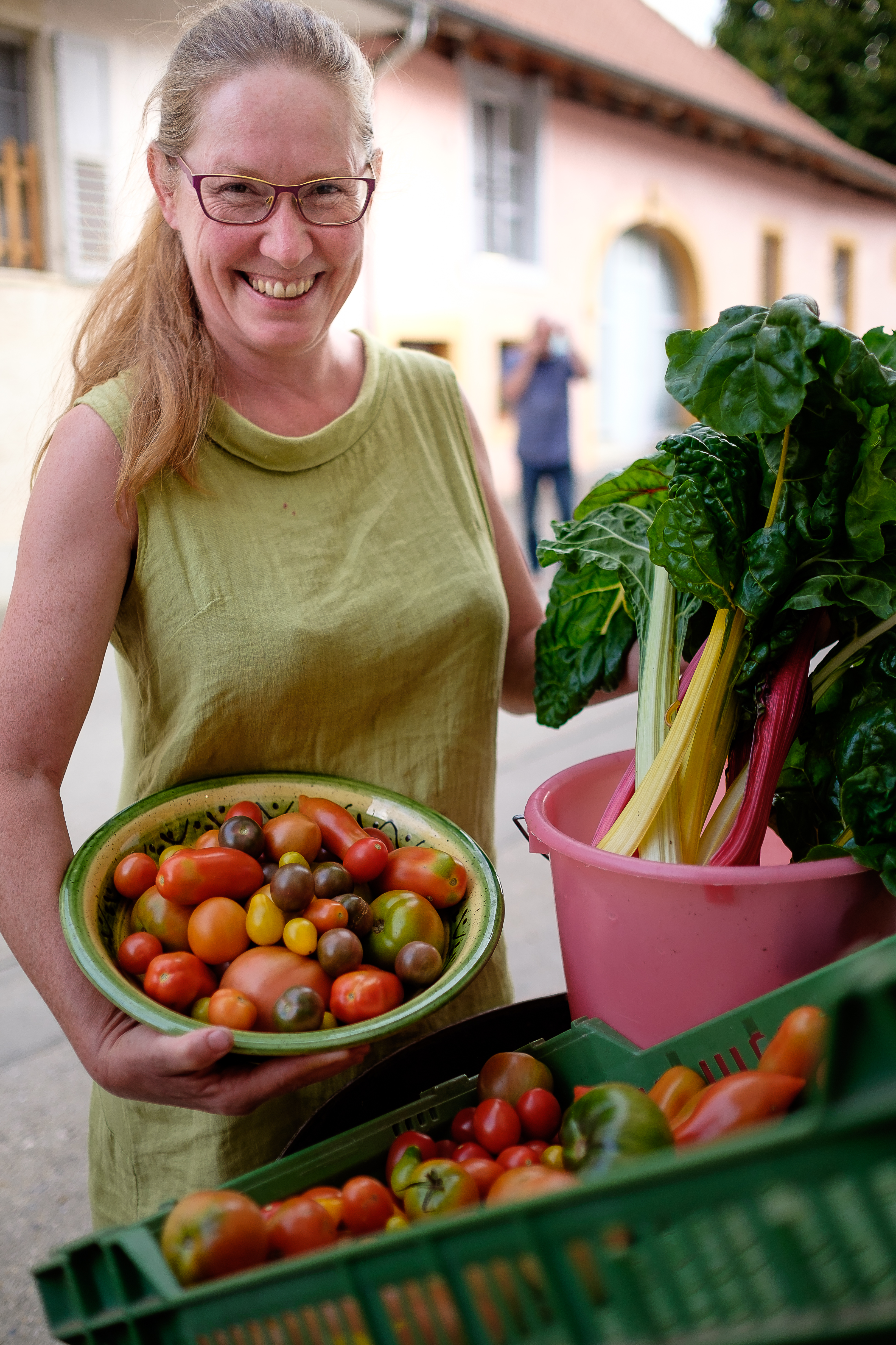Annie qui s’occupe des récoltes, de la transformation des produits, des marchés et livraisons, ainsi que de notre magasin à Bonvillars et moi-même, gérons notre petit domaine à Bonvillars. Nous produisons sur 5 hectares des céréales, légumes, petits fruits, raisins, truffes, olives et transformons une partie en vin, huile, tisane, bouillon, pesto, sirop, etc...